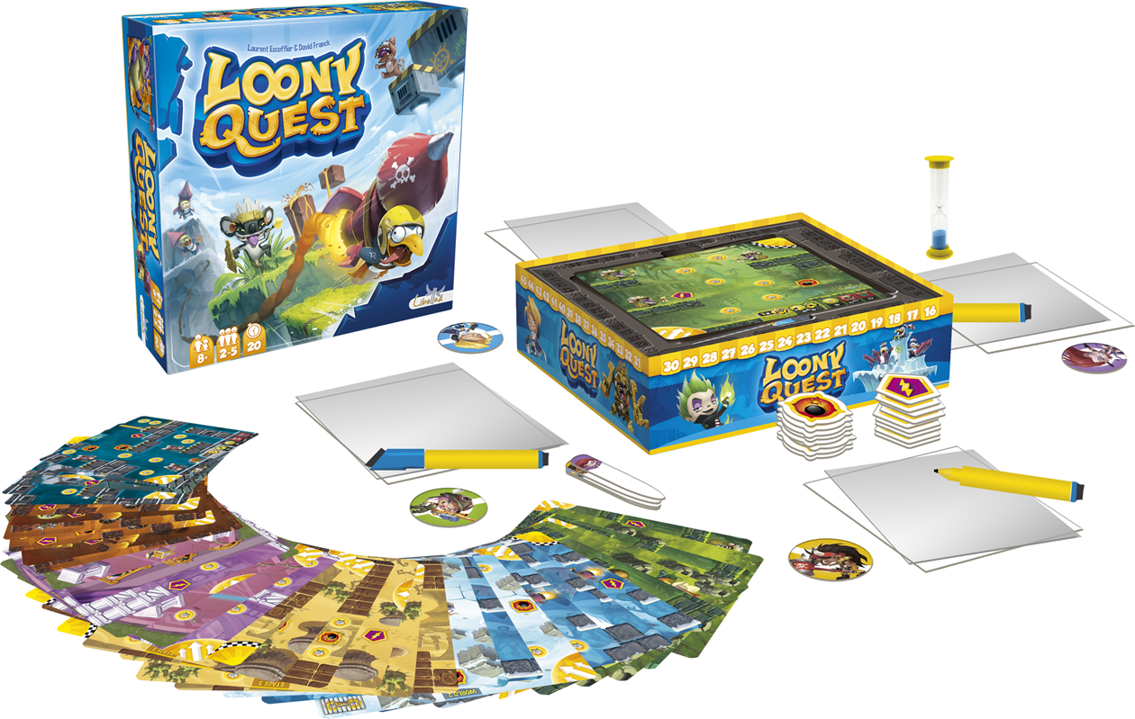 Most games—even the best—are often variations on tried-and-true themes. But occasionally you see something you’ve never seen before. Such is the case with Looney Quest (née Doodle Quest), the game of competitive line drawing. Players are shown a picture of a playing area, and must then draw a line on a transparent sheet that, when placed over the central board, will trace a path from start to finish, collecting rewards and avoiding obstacles along the way. The whimsical art—and that it tests skills that are as developed in children as in adults—make for a game that can be enjoyed by entire families.