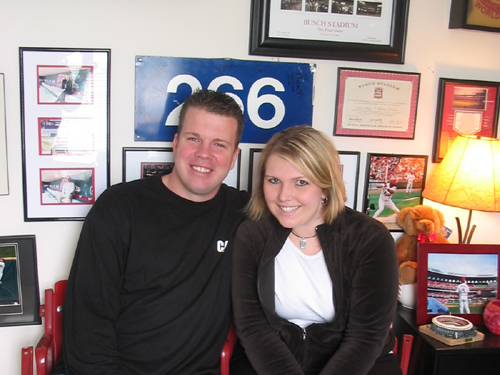 Travis: We met in the Cardinals sales office in January ’05, on Mel’s first day. She’d torn her ACL during a skiing accident.