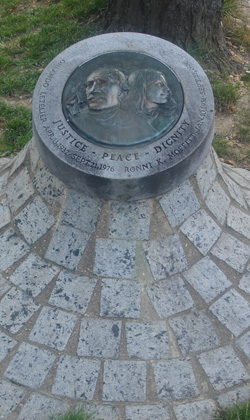 The memorial to Letelier and Moffitt, shaped like a short tree stump with a round plaque on top, sits at the southeast corner of the circle, close to the point where the car came to rest, against a Volkswagen Beetle, after bursting into flames.