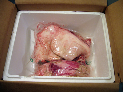 The jowls arrived right on schedule. They were packed in a foam cooler-type box, vacuum-sealed in plastic, along with a few ice packs. Considering they had traveled nearly 3,000 miles, the cheeks were shockingly fresh-looking. Bloody and sinewy, the meat was even shaped like a pig’s profile.