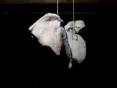 Thoroughly rubbed down, the salt immediately began to do its work on the bacteria and enzymes as the cheeks rested in the refrigerator. After just a day, the jowls began to release liquid. In a week’s time, I would need to take them from the refrigerator and hang them to dry.
