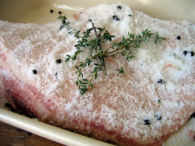 I began to have visions of crafting my own cured meats. My memory raced back to a recipe for guanciale I remembered reading in Mario Batali’s The Babbo Cookbook (also online here). The Italian name for a pig’s jowl (guancia) that has been cured in salt and dried, guanciale resembles pancetta or bacon. Like saffron or truffles, guanciale is one of those fundamental ingredients for which there is considered to be no proper substitute. Were you to make a classic pasta such as bucatini alla amatriciana and replace guanciale with pancetta or bacon, you would be committing some kind of culinary heresy.