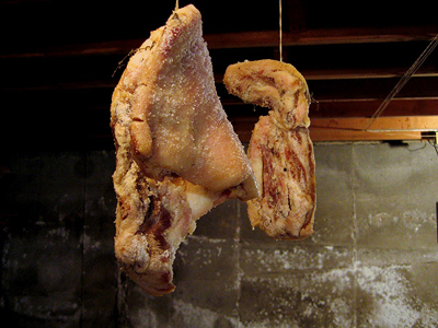 Several weeks after the denouement of our Roman feast, after which we froze the remaining chunk of guanciale and called a moratorium on dining on pork fat, we got a call from the owners of our Long Island curing cellar, letting us know that they had found a pig’s jowl in the basement that had shrunk to half its size and was “covered with black spots.”