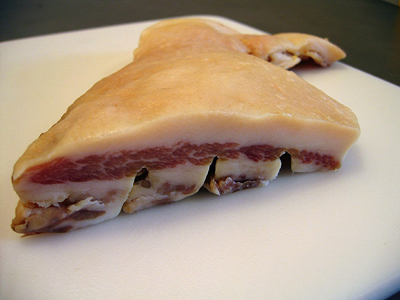 I cut off a slice, mostly fat striated with thin strips of flesh. It looked like bacon. I fried it in a little olive oil until crisp, drained it, and put it in my mouth. As I bit into it, the taste was like pancetta or bacon, but perhaps with a stronger flavor of pork and a slight sweetness along with the salinity. It was much fattier than pancetta, but once it was cooked, most of the fat had rendered, leaving behind a crispy puff of porkiness.
