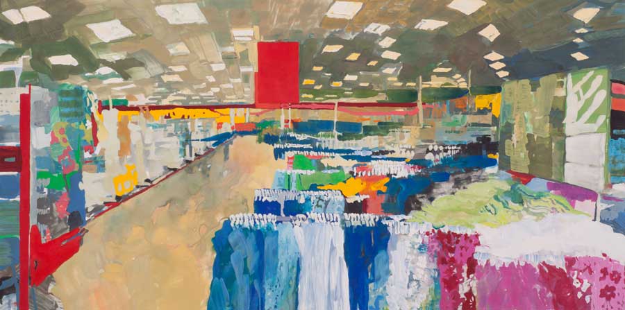 What I like to look at is the experience of what’s familiar. A Costco really has a charm to it. But when I paint places like a Target—everything is in their colors, everything has to pop—I become more aware of the manipulations. At Costco they’re little vignettes—gingham check over a fancy table, things in that moment that are supposed to make you feel like home. That’s what I try to bring into the paintings.
