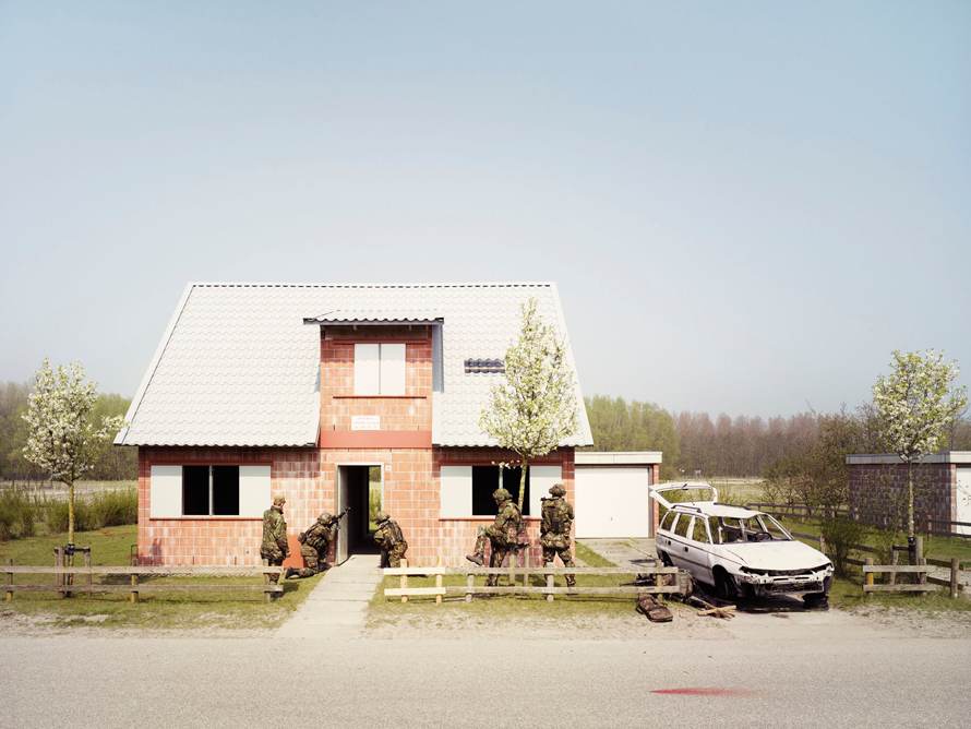 Jeroen Hofman: In these facilities it’s all just play: stage-acting on a few enclosed square meters. If you make a mistake, you get to try again. Wrong decisions do not have fatal consequences. But what I call “Playground” will someday become reality for the people in these photographs. For some this will happen sooner than they think. The Marine Corps trained at Marnehuizen for their mission in Uruzgan. They were the last group that shipped out before the mission was terminated. At the edge of the training ground they’d built a small compound surrounded by a wall like the ones you find all over Afghanistan. It was the marines’ job to go looking for explosives and narcotics. Two months after I made the photograph, they were sent to Uruzgan. A few of those marines lost their lives there.That’s the dividing line where “Playground ends” and reality begins—the deadly seriousness that follows, the real world, I would not like to be standing over that in a cherry-picker.