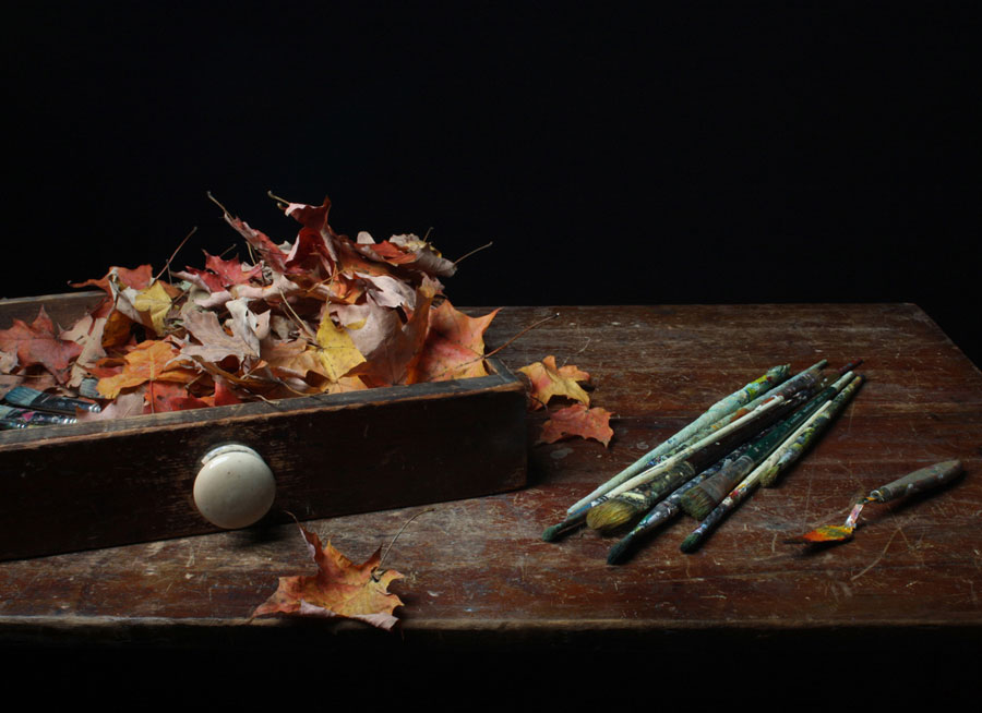 I work very intuitively, so setting up one of the still lifes is like putting a puzzle together; I have all the pieces laid out in front of me but I have to figure out where they go. It is a very slow and meditative way of working. I’m using a four-by-five camera and studio lighting so that also helps slow down the process a little.