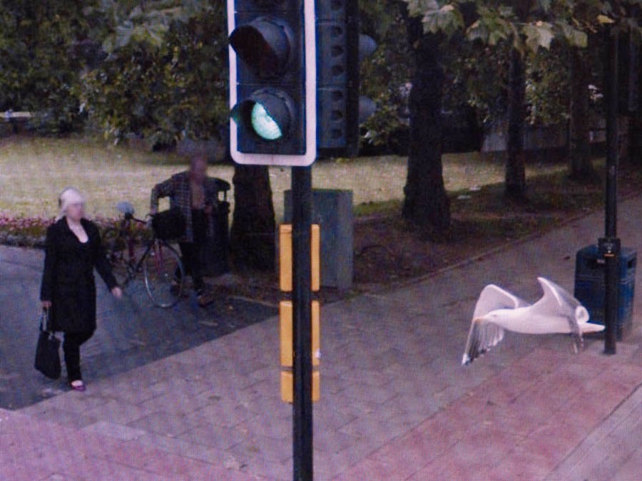 Lifestyle, behavior. Because of Street View, it’s a platform that I’m interpreting, something very intellectual is happening also. I’m interested in, of course, how the crop affects the picture and what elements I can bring together. I thought the birds I saw on Street View were absolutely amazing. They’re like this red thread going through all the cities at street level.
