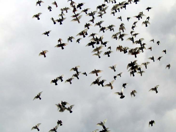At first, the flocks aren’t easy to spot, but then the black dots whirling in the low sky become visible. The black dots turn in unison, left and right, as if they are all tied to the same string. Many coops have rolled out their birds this afternoon. There must be half a dozen flocks out there. The flocks become more visible against a white cloud, but when the sun shines a certain way, the light catches on the wings and the flocks shine white. They circle around a roof, but then slowly spiral out toward other places, depending on how the wind is blowing or whatever catches the instinctive fancy of like minds. They look like little tornadoes.