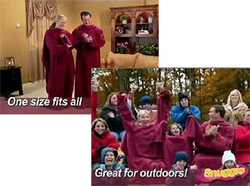 After the success of the Lord of the Rings films, the Harry Potter series, and World of Warcraft, you’d think the shameful stigma associated with owning and wearing a cloak would be a thing of the past. But no, apparently we still have to refer to them euphemistically. Enter Snuggie*, which bills itself as “The Blanket With Sleeves Exclamation Point,” which was presumably a catchier slogan than “The Poncho That Leaves Your Ass Hanging Out Upside-Down Exclamation Point.” Comes in burgundy, royal blue, or sage green, making it the perfect gift for the closet fire mage, cleric, or druid on your list. And if you order now (says the website) you’ll also receive a second Snuggie for free, as well as a portable book light. Maybe you’ll also get a “battery-powered massager” for your “tension headaches,” if you “know” what I “mean.”