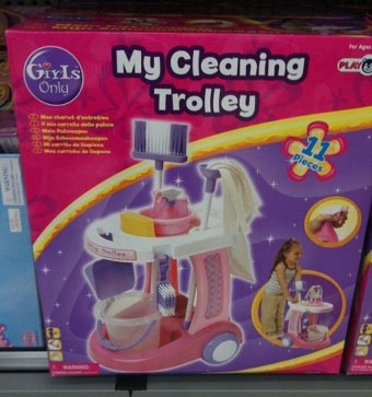 Men’s rights groups have flourished, tackling issues from child custody to male-only military conscription. But no greater example of sexual discrimination has surfaced in recent years than My Cleaning Trolley…marketed “for girls only!” Well here’s your chance to rage against the maSHEne: Proudly give this gift to all the boys and young men in your life who aspire to a bucket-related occupational field. “Includes a real working water sprayer” crows the website, as if that were a technological accomplishment on par with the bionic johnson.