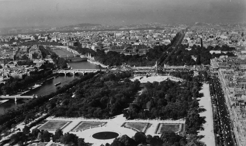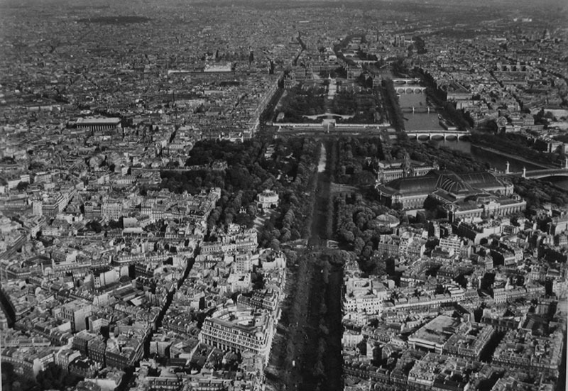 Henrard was not the first photographer to capture Paris from a flying machine, but his approach differed from that of his predecessors, and his artistry contrasts with the cartographic dimension of government-commissioned reports. Bird’s-eye views of Paris existed prior to the aviation age, and Henrard’s photographs are links in a long chain—from prints that predate the age of the aerostation to today’s digital satellite photographs. This chain is really two-fold—one strand comprises views or panoramas taken from towers or steeples, the other consists of pictures from aerostats and flying machines of all kinds, from the latter half of the nineteenth century onward.