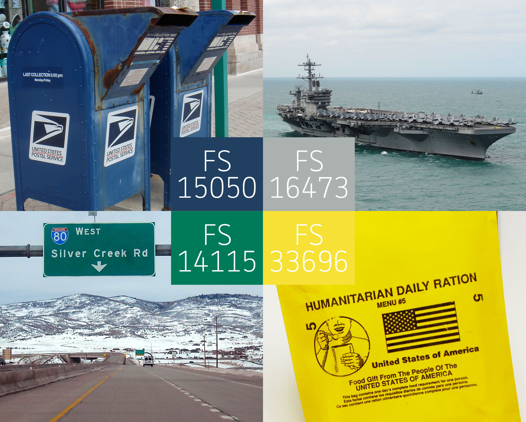 The first iteration of the Federal Standard Color Palette contained 358 colors: lots of greens and browns and grays. The majority came directly from the 216 hues (72 colors, each in three glosses) established during the Second World War, plus the blues, yellows, oranges, purples, and reds of various seals and insignias, as well as bold colors used to indicate the contents and direction of the engine-room pipes running beneath everything from military bases to battleship decks. They were paint and finish colors first and foremost, but served as reference for textiles, paper products, and dyes too. As federal agencies flush from the post-war boom began to expand, they were forced to address road signs, mail trucks, office furniture, and all sorts of other governmental trappings that were patchy from decades of inconsistent outsourcing and updating. In these years, the federal palette caught on among domestically focused agencies, and a series of temporary additions known as “change notices” added hues requested by the Postal Service, the National Park Service, and the Dept. of Transportation. In 1968, these change notices were incorporated into the first of three major revisions of FS 595, thenceforth known as FS 595A.