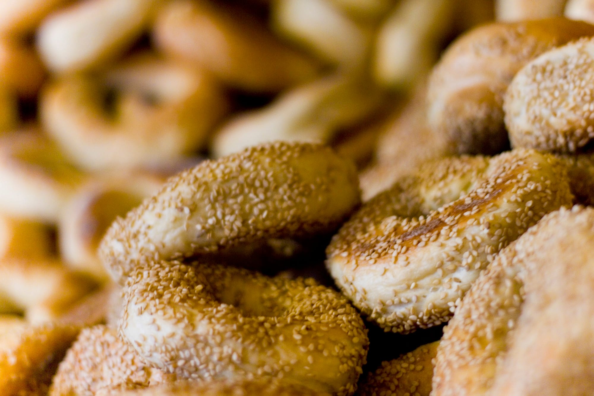 Bagel baking is very percussive, and working in the back you’re always dividing or opening or closing or rolling. You open the oven and the bagels go in, you open it again and out they come, cascading into a baker’s basket, showering your forearms with white hot sesame seeds, pricks of pain that fade away before they ever register.