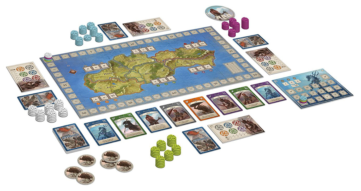 Judging from the art on the box, the goal of Ethnos is to wantonly slaughter your enemies on a dark and blood-slicked battlefield. In reality, you are…playing rummy, essentially. Which isn’t to say things don’t get tense. Each card in the deck has both a color (which corresponds to one of the six territories on the board) and the name of one of the six fantasy tribes in the game. On a turn a player either takes a card into their hand, or plays a set of cards of either all the same color or all the same tribe. In either case, they will place a control marker onto the board; at the end of each of the three ages into which the game is divided, points are awarded based on who has the most markers in each territory. That alone would make for a solid, if somewhat predictable, game. But Ethnos livens things up by giving each of the tribes a special power. Centaurs allow you to play two sets of cards on your turn instead of just one. Wizards summon more cards into your hand. Halflings refuse to fight, but there are twice as many of them to collect. And, better still, the six tribes used in a game are randomly selected from a total of 12, making every play a unique experience.