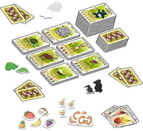 Fabled Fruit starts as a very—one might even say overly—simple game. Before play, a number of tarot-sized Location Cards are placed onto the the table, face up. On a turn, a player moves their piece to a Location and takes the associated action—e.g., draw two Fruit Cards from the deck, give another player a banana Fruit Card and receive two Fruit Cards in return, or whatever. Alternatively, a player can move to a Location, play the set of Fruit Cards shown on the bottom (two coconuts, two grapes, and a pineapple, for instance), and claim the Location Card as a point, after which a new Location Card is dealt onto the table from the deck. The fascinating thing about Fabled Fruit is that the Location deck contains approximately 30 times more cards than you could ever get through in a single game, and they are presorted in a specific order, with the simplest cards on the top, and the more complicated and subtle cards further into the deck. This deck is never shuffled, and the state of the deck carries from one game to the next. The first time you play, you may see the initial eight locations; the next time you play you start with the locations you ended the last game with, and may work through an additional four. In other words, Fabled Fruit evolves not over the course of a single playing, but from the first time you play the game to the last. This is a great game for a family, or any group of players who will always be playing together and can jointly experience the trajectory of the experience.