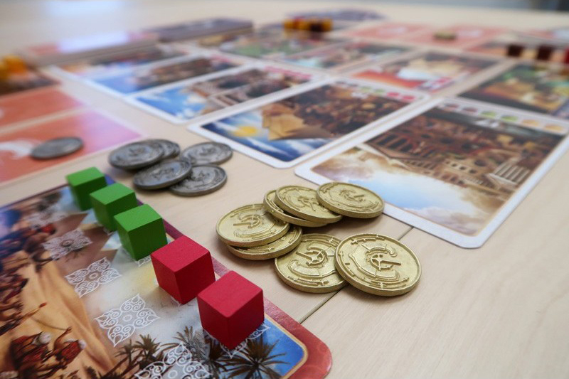 There are four spices: turmeric, saffron, cardamom, and cinnamon. There are traders, who will exchange some spices for others. And there are Point Cards, which require spices to acquire. Players begin by establishing relationships with key traders, and then use them to convert the spices they own into those they need; a crafty player will forge alliances that allow them to chain transactions, visiting a trader who gives two saffron for two cardamom, say, and then another who offers two cardamom and a cinnamon for those two saffron, and then back to the first to start the cycle anew, banking the “free” cinnamon as they go. Build the most efficient network, and secure victory in Spice Road, the first of a planned trilogy of games that looks at trading through the centuries.