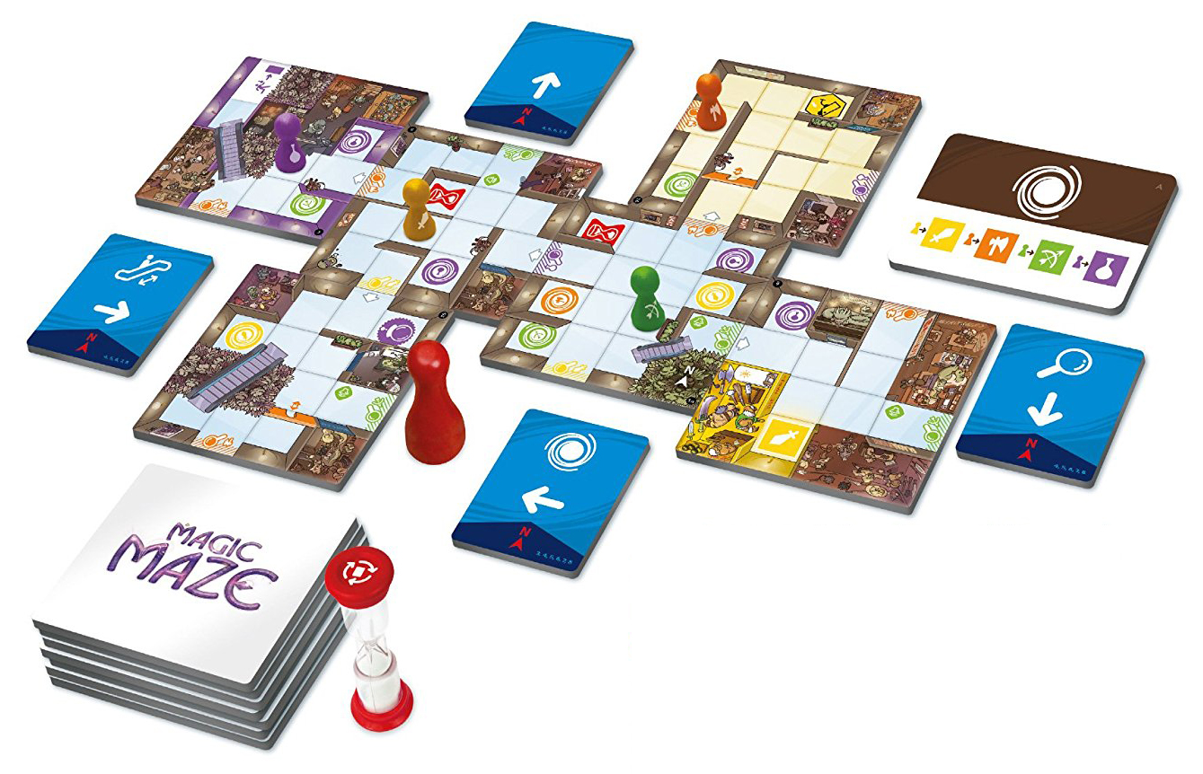 “Everyone I have introduced this game to loves it!” That is a statement that I: A) often use when recommending a game; and B) can in no way apply to Magic Maze. In fact, several people to whom I have introduced Magic Maze loathe it. But then, a frantic, real-time cooperative game in which players must make collaborative decisions without speaking to one another ain’t for everyone. An elf, a dwarf, a wizard, and a barbarian walk into a mall (stop me if you’ve heard this one), and seek to steal the items they need to equip their party. The trick of the game is that no single player controls any given pawn—instead, one player controls “go north” while another is in charge of “go east”, only one can move the pawns through doors, and a fourth is in charge of moving them up and down escalators. Without communicating (except in very constrained circumstances), the players must cooperatively move the four pawns to a series of designated locations on an ever-evolving map, all while a three-minute timer ticks down the seconds until Paul Blart shows up and nabs the lot for shoplifting.