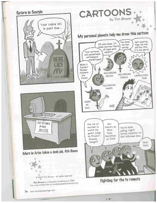 “I analyze people’s behaviors and energies in the most objective way I can muster (Aquarius rising),” says cartoonist Tim Brown. “Amazed at the uncanny results.” In a cartoon in which Brown draws himself drawing a cartoon (the exact one we see on the magazine’s comic strip), his critical Aquarian Mars hovers above him: “Your cartoons only perpetuate astrological stereotypes!”