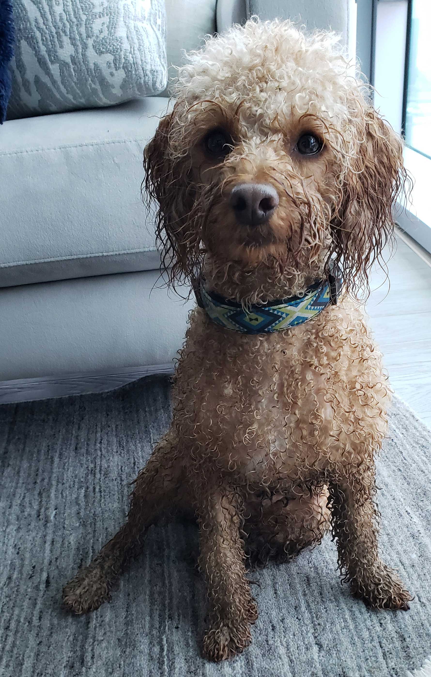 Anita: My little apricot cockapoo, Remy! Extremely outgoing and friendly, he loves playing with a ball in the kiddie pool at the dog park. No kiddie pool? Any mud puddle will do. He wants to sit in my lap 24/7, and I will remark that it is very hard to do work with a dog's head resting on your arm.