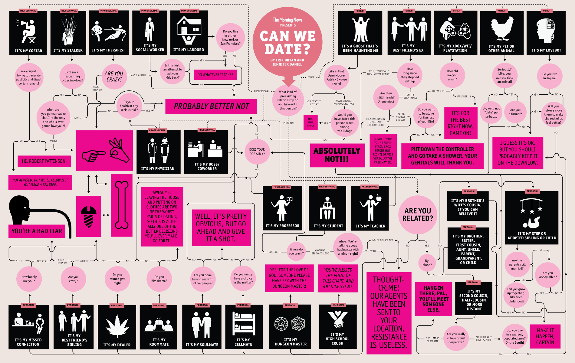 Degree of relation determines the acceptability of relationships. Like, even if you’re not related by blood to someone, there are, as I reckon, about three levels of relations that should be considered when deciding who you can date: “personal,” “professional,” and “other.” Of course a lot of that “other” is going to be concerned with instances, like, say you’re at a kegger and you meet a Japanese foreign exchange student and you’re both really drunk. Obviously you wouldn’t need our advice to know that there’s practically a frat’s-worth of third base coaches waving you in. The following flowchart, then, is intended specifically for cases like your own, where the higher degrees of relation come into play and the other cases are more problematic. Commence flowchart!