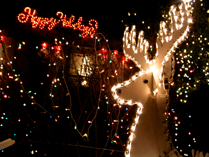 After a few minutes of sightseeing in Dyker Heights, one can’t help but be struck by the handful of houses that stand naked and plain. Are their owners dead inside? Or Jewish? What might it be like to celebrate Hanukkah in a neighborhood like this? Could DiMeglio Holiday Decorators be retained to construct a two-story menorah with 36 candle holders? Or a giant, self-spinning, talking dreidel: “Ho Ho Ho. Can you believe you landed on Gimmel? Now give that lucky Jew all the pennies!” While I was considering this and wondering out loud why someone would have stolen all the baby Jesuses from the mangers, a couple called out from their station wagon. I immediately sized them up as Jewish—they had the trademark fangs and yellow eyes. A woman leaned out of the passenger side and asked, “Which block is the Small World house on?” I broke the bad news, and her mouth turned downward. “Oh, how could they? Oh, well, merry Christmas!” the couple offered. “Merry Christmas,” I replied, from one Jew to the next.
