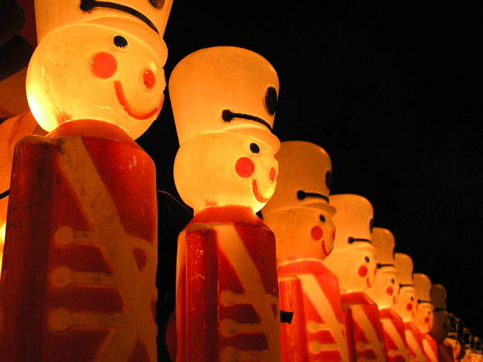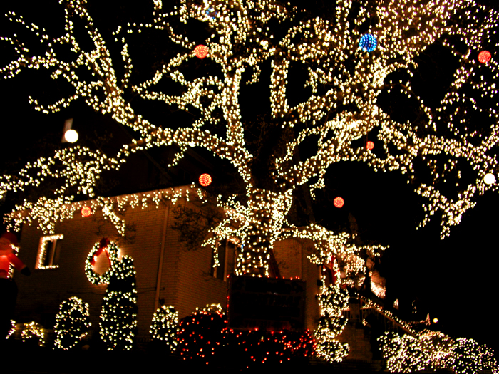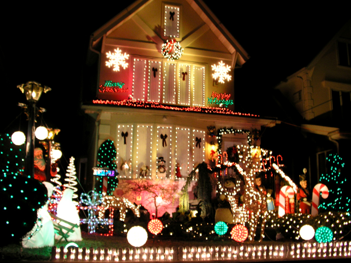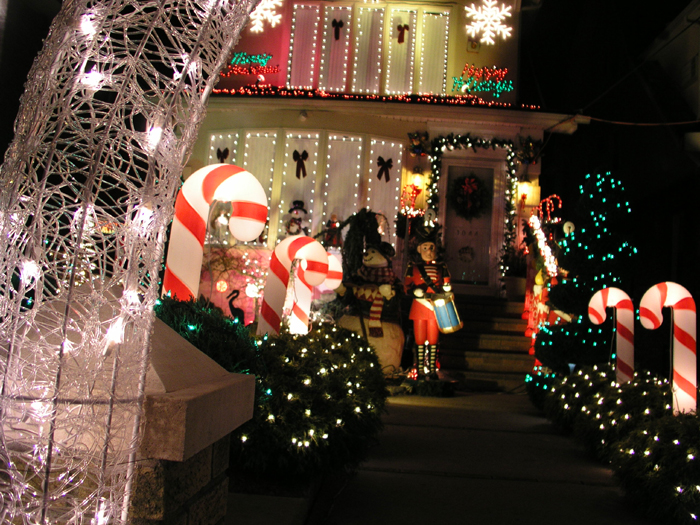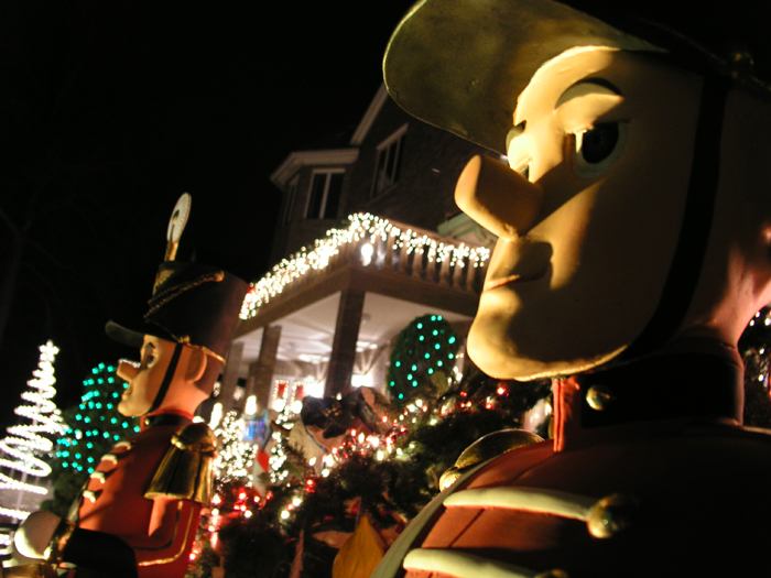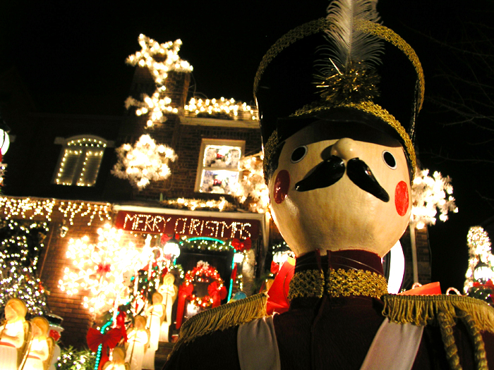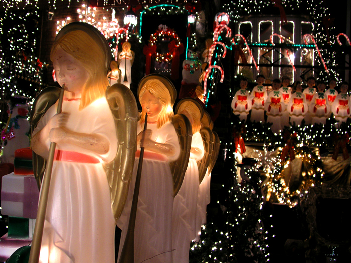 Each tableau of Dyker Heights suggests a confusing narrative where each successive page has been scribbled over the previous. An infantry of illuminated toy soldiers protects a manger scene while, in front of it all, an extra dressed in an Elmo costume holds out a donation bucket and a furry handful of peppermint candies. Elsewhere, a Mrs. Claus marionette inexplicably cage-dances on a one family’s front lawn, with her husband several feet away, fidgeting in his own cage. But why are they imprisoned? There seems to be a crucial interim scene missing, but it doesn’t matter, because there is precious room for analysis when your senses are being taxed this hard. From one home to the next, if your peripheral vision detects even a single patch of lawn, or if you can find your way to a doorknob through the tangle of plastic figurines, tinsel, ornaments, and wiring, it is probably the result of someone’s gross negligence.