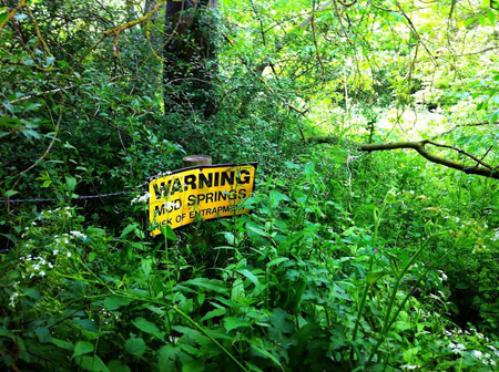 Ella tuts in frustration, but she understands my point, and returns to my side. We walk around the edge of springs, peering in at the fence at the dense undergrowth. Every now and then we spy an overgrown yellow warning sign, yelling at us: “WARNING: MUD SPRINGS. RISK OF ENTRAPMENT.”