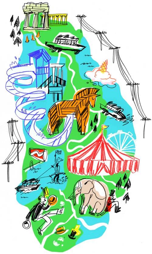 I glanced over his shoulder out the window at a 65-foot Trojan horse, Mount Olympus Theme Park’s centerpiece lawn ornament. It would have been more imposing if it didn’t have a go-kart track disappearing into its gut. Or a replica of the White House—upside down, no less—behind it.