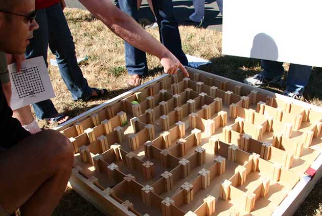 The “B” Ark has walkie-talkies, but we accidentally left them in the van; at this point the van is so cluttered with paper, food wrappers, and flotsam from previous clues, that it would probably take us 20 minutes to find them anyhow. So we charge into the maze with no plan whatsoever.