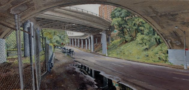 A few blocks away is the South Williamsburg flat we’d called home before ascending to an aerie on the island. Then as now, the neighborhood feels subhuman, an unwelcome convergence of bridge-exit traffic, a stop on the J train, and right above the BQE—such that a dinner plate, left on a counter for a night, would the next morning be coated in black grit—and I see that under the tracks, a cup of soup has spilled its guts. It’s revolting, like a tiny vulnerable human body has been smashed. Nearby, a UPS guy struggles under the weight of a package and staggers in what is now a driving, icy rain. I’ve walked about two miles so far. An ambulance rolls through a stop sign, crossing under the tracks, and I swear the old woman inside is moaning.