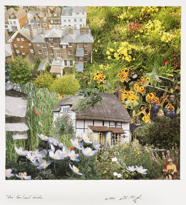 We certainly have found—a good example of “The Fractured Garden”—that one of the great joys of seeing all realities as malleable and layered, but the layers being gossamer-thin, illusory if we glance askance, is noticing what Breyer P-Orridge have nicknamed “Sacred Geometry,” a symmetry that is revealed, that as elements of a collage are moved about, exact matches of tones happen too, shadows giving a conviction the eye accepts through habit when what it is seeing, studied closely, is an impossibility. The Japanese zen garden stones have no logical right to float in the air at one side. The London houses are totally geometrically out of perspective. Yet, the most common initial feeling of the viewer is a sense of order and “rightness” that only falls apart upon closer examination. Angles and lines often jump out only after cutting-up and reveal intersections and perceptual relapses because of the act of juxtaposition in contradiction of logic. In that sense we could say we cannot, and will not accept limitations as the whole process is about restructuring and deconstructing to see what we would always miss if we accepted a visual world as we are told it already is.