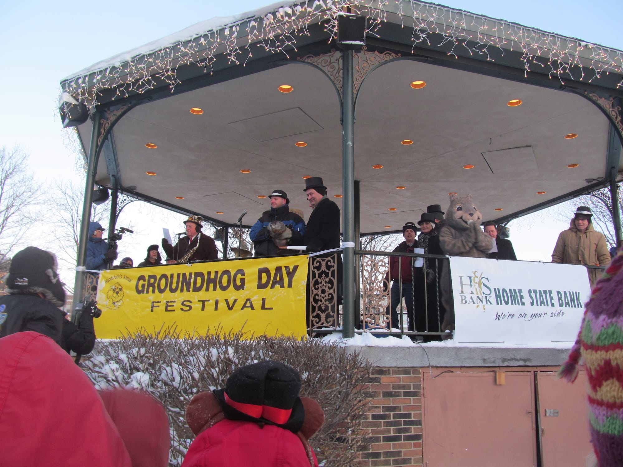 When light dawns, we head out to the square. About a hundred people are gathered, bundled tightly, to hear the weather report. The band plays “Woodstock Willie’s Polka.” It includes the line, “everybody had the mania / to sing in Woodstock, not Pennsylvania,” which gets a big cheer. Richard Henzel, who plays the DJ in the movie and usually comes down to reprise his role for the festivities, has canceled due to the weather, so Bellairs and fellow committee member Craig Krandel step in to do the morning DJ bit as people in the audience shout along. A representative from Home State Bank, Groundhog Days’ biggest sponsor, knocks on Woodstock Willie’s log, and, after a brief huddle, six more weeks of winter is declared.