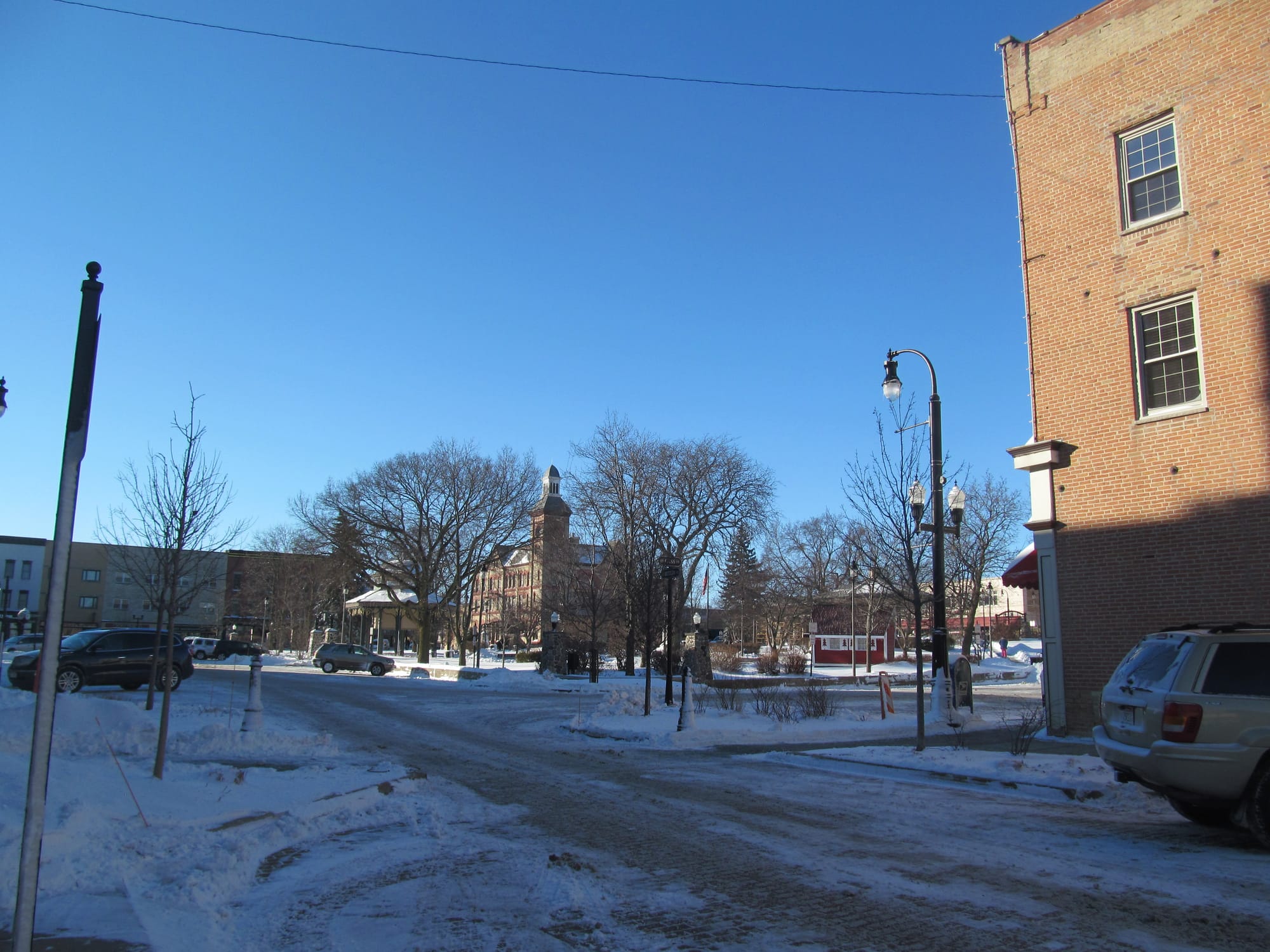 At 6:00 this morning, I set out for Woodstock Square by foot. The clerk at the Best Western called a cab for me, but there was no answer. It’s four degrees outside, and windy, so when I see a building labeled police department, I walk in to ask for a ride. After some questioning, my request is granted, and I find myself in a police cruiser with Officer David. There were no cabs, I tell him apologetically. “Oh, there’s one guy,” he says. “But, you know, he’s been busy with the storm and the Super Bowl and all.” He grants my request to sit in the front seat and drops me at the square, just in front of Starbucks.