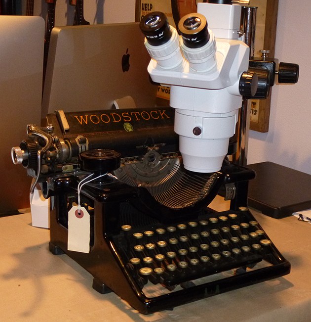 And Alger Hiss’s typewriter? I think it’ll be our last one. After 35 years, Jeff says he’s solved the case and that the huge digital microscopes that surround the typewriter will clinch it. I’m already trying to figure out what we can do with all the extra space. In the meantime, the typewriter already has its own fan club. Friends have come over to see it and have their photos taken with it. Even the Woodstock seems to know something is up. In fact, it appears to be smiling.