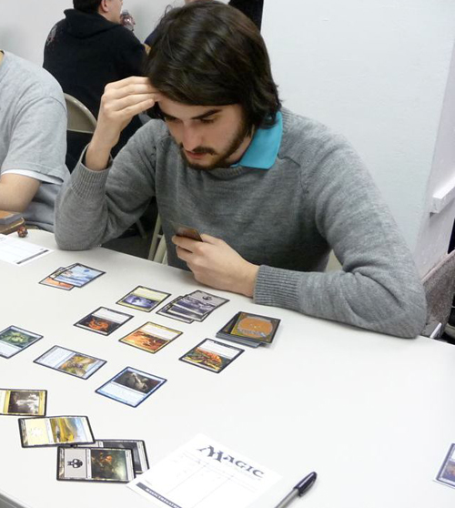 My opponent in the first round could be Magic’s diplomat at the U.N. A cheerful man in his early twenties, Bryan sports a thick pair of black-rimmed glasses and a mossy fur-growth that covers most of his neck. Upon my sitting down he extends an enthusiastic hand for shaking, his face twinkling with joy.