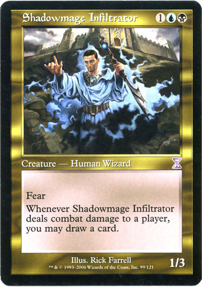 I look up and see Jon Finkel walking toward me; I recognize him from the videos of his world championship win, and also from the illustration of “Shadowmage Infiltrator,” the card famously based on Finkel. Stubbled but well-kept, Finkel is built like someone who keeps barbells under his bed, and has the whitest teeth of anyone here. He grabs my hand, we fall into chairs, and training begins.