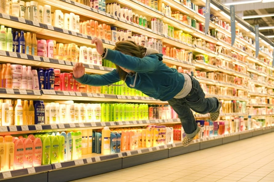 When we do a shoot, we go to the supermarket, but not such a big one—big but not so big. They asked me to come to the supermarket very early in the morning before opening, around six or seven o’clock in the morning. And the young person came, and I’d ask them to make this street-type kind of jump, one very inspired by La Chute, where people are floating in the air. The second type of attitude was feeling like it was a fight, like a punching ball. Really to express the violence of this consumerist society to be like an aggression.
