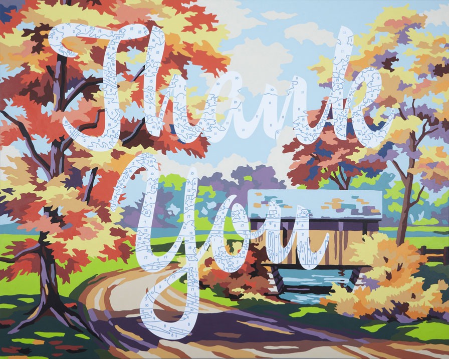 Trey Speegle’s paintings combine the highbrow and lowbrow with a nod toward Pop Art, overlaying meticulously altered vintage paint-by-number graphics with messages to the viewer.