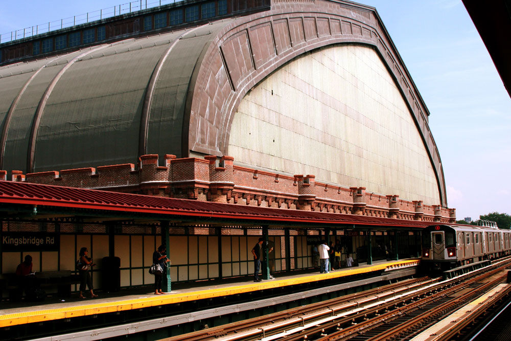 At the Kingsbridge Road station, four stops from its terminus, the train stands shiny and largely depopulated beneath an enormous tin-plated façade reminiscent of an Uzbek madrassah. It is the eastern wall of the Kingsbridge Armory—a Bronx goliath and Jerome Avenue landmark that, when built in 1917, featured the largest column-free interior in the world. The massive space has been empty since 1994, when the National Guard pulled out of the four-block fortress.