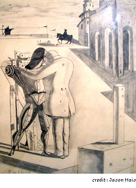 Earlier in the week a colleague bounded into the office, all excited; he thinks he’s found a de Chirico sketch, bought in the weekend market on Portobello Road for just £150. De Chirico was a fabled forger, perhaps even more so than that other artistic mythmaker, Salvador Dali. In later life Giorgio would casually sign blank pieces of paper or even other people’s imitative sketches, making accurate catalogue of his vast oeuvre nearly impossible. I look at the blurry digital photo (see above) of the newly-acquired drawing; an empty plaza, a colonnade, a plinth. Its emptiness is perhaps two-fold, no value as well as no people. De Chirico’s vision conjures up hot sun on gravel and white walls, a million miles from London’s litter-strewn and pigeon-filled public spaces. It’s an alien culture that exerts a powerful draw. The word “piazza” is bandied about by British architects and town planners, as if the climate and culture of the Mediterranean can be semantically implanted. It’s a dream that’s kept artificially alive: the nearest we get to these imaginary cityscapes is the self-imposed emptiness that comes from London’s carelessly zoned city center; thronged during the week by commuters, abandoned on weekends, bereft of tourist attractions and family homes. The desultory roadblocks of the so-called “Ring of Steel,” bored policemen in fluorescent jackets, standing by ribbon slabs of truck-stopping concrete, look even more incongruous.