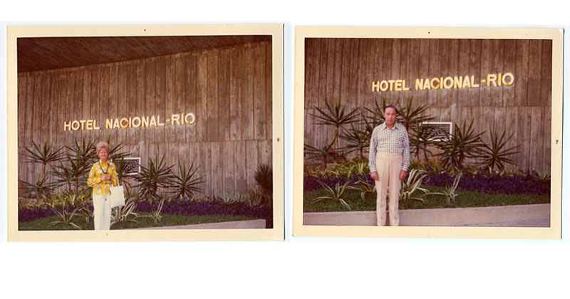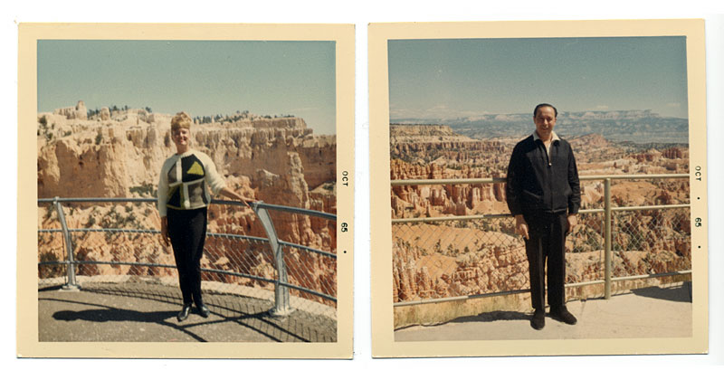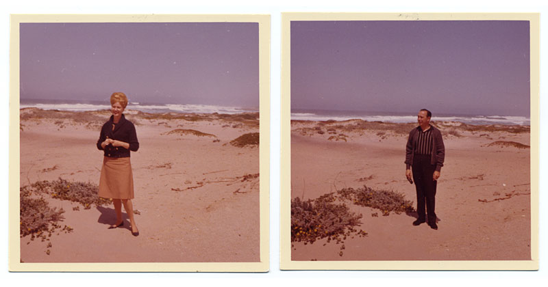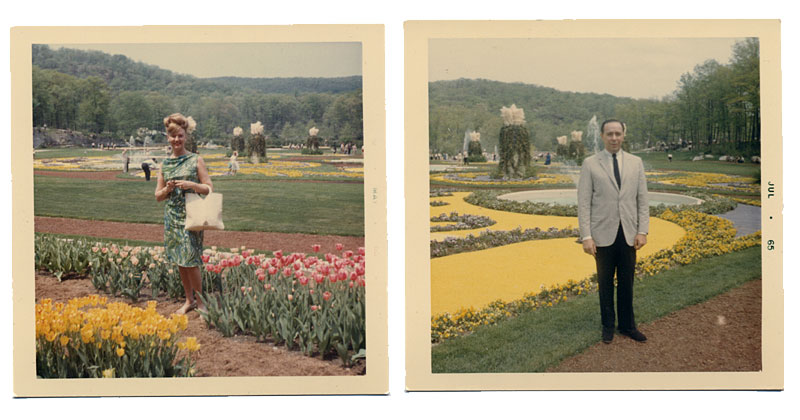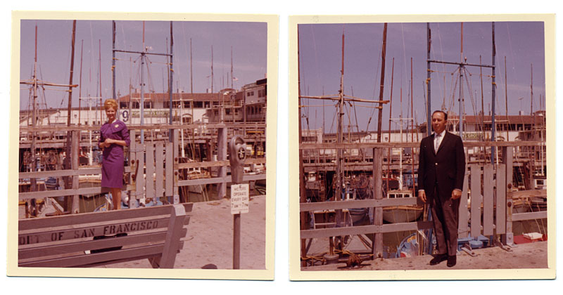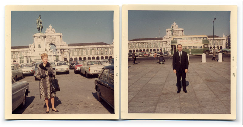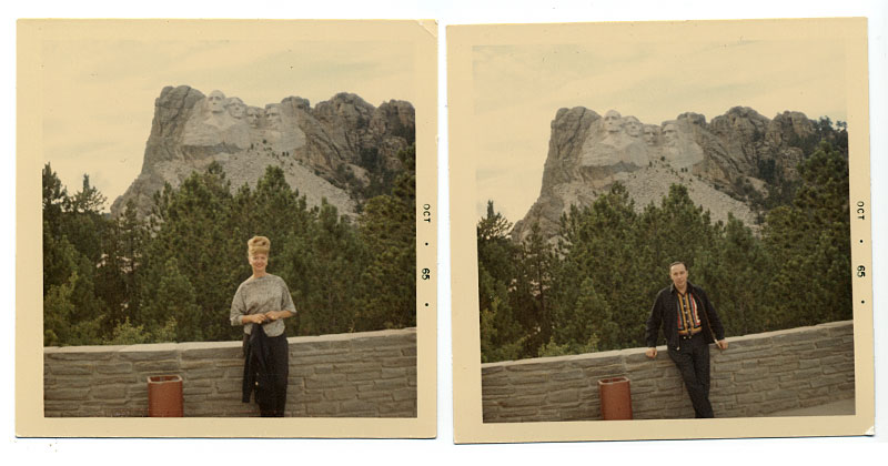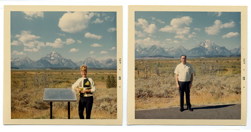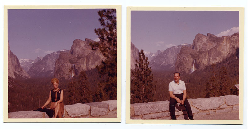 Back at home, I started organizing the photos—most of them had written information on the back. The first photo is from 1953, and the last one from 1977. In most of them are a man and a woman, a couple who took photos of themselves for more than 20 years. The woman was probably the one writing on the back as the man isn’t present before 1958, and we see her with another man in 1956. This couple traveled a lot; there are photos from lots places in the U.S. and abroad; they made a habit of capturing each other in front of famous places and views.