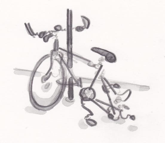 So I lose a wheel, but gain a story. And now I have a new wheel, too. As I roll home, I think of all the parts that have been stolen from my bike over the years, enough parts to build a new bike: one saddle, two wheels, one derailleur, the front brake, the back brake, the chain, four lights, a frame (stolen by rust), a bell. My bike is no longer my bike. It’s all parts. The only original part may be the lock.