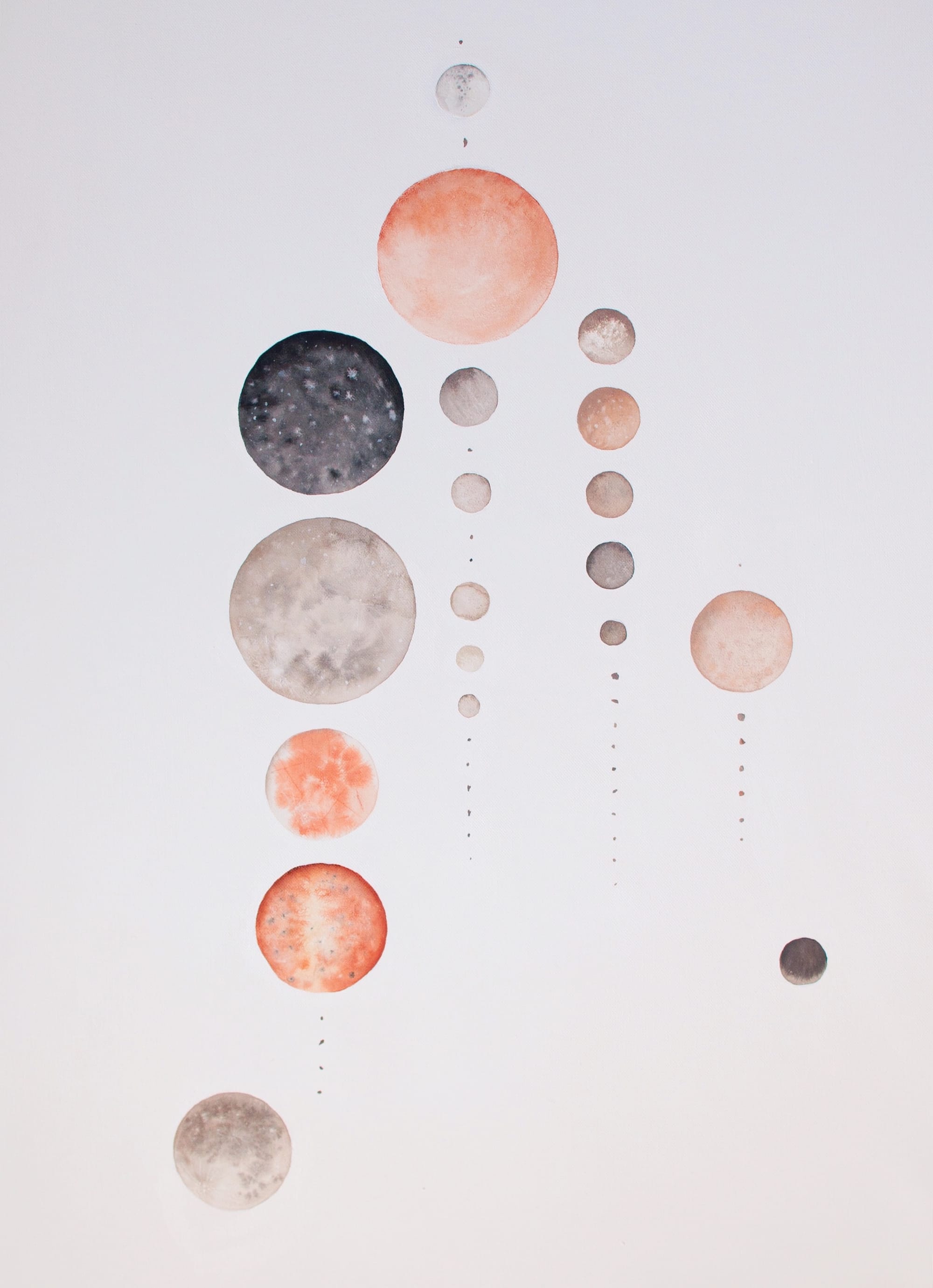 Stella Maria Baer: During the years when I was painting animals, I was often “distracted” by things that happened by accident while I was painting—the colors bleeding into one another, the movement of paint in the water. But I’d force myself to focus on painting animals. I spent most of 2012 moving from one commissioned animal painting to the next, most of them portraits of people’s spirit animals, and by the end of that time I burned out. I lost track of my own vision of what I wanted to make. I decided to stop taking commissions and to explore the things I had dismissed as distractions—the moments in my painting that felt out of control and more like play than anything else. For a while I made abstract color studies. Then I saw a photograph of a lunar eclipse and I decided to make a painting of the moon. In the sphere I found a balance of limitation and freedom, a way I could experiment with color and bleeds within a space that felt both infinite and finite. Continue reading ↓