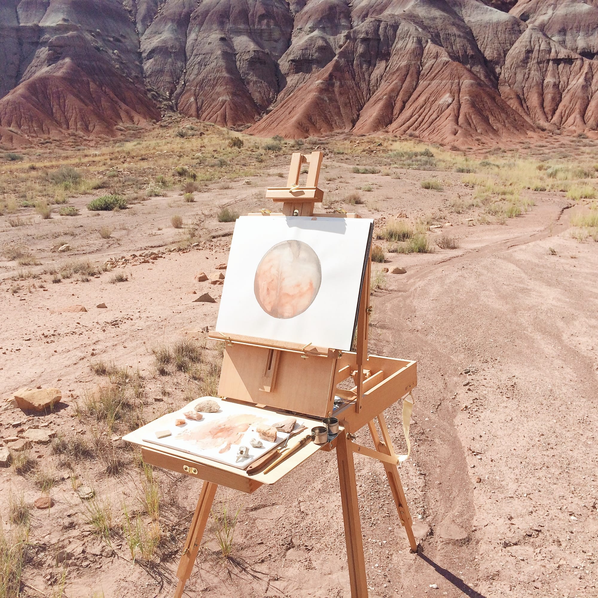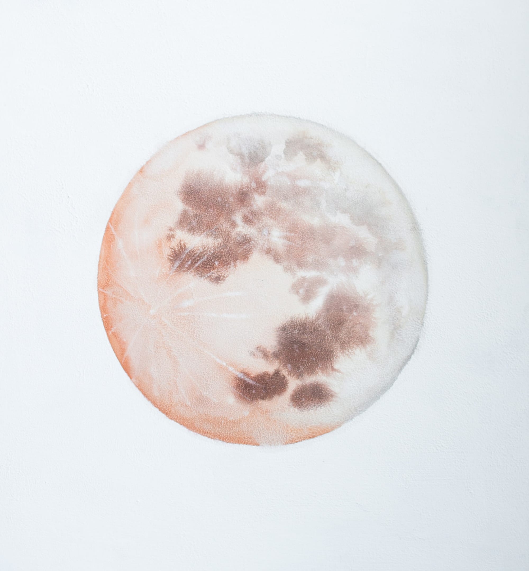 Around the same time I was thinking a lot about where I grew up in northern New Mexico. When I was in high school I couldn’t wait to leave Santa Fe, and for many years I didn’t go back other than to visit my family. But around a year and a half ago that changed. I drove down to White Sands in southern New Mexico and for the first time I fell in love with where I was from. Then I took a road trip with a friend through the Mojave Desert and Arizona. When I got back to Connecticut I was haunted by the canyons, the colors, the lines. Painting moons and planets was a way to bleed out my memory of the desert while still moving into another place. There was a mythology of the desert that overlapped with the cosmology of space.