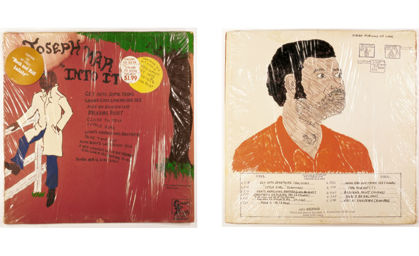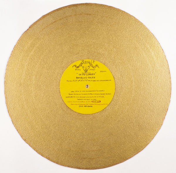 These handmade records—found at a flea market and “recorded” by an unknown singer, Mingering Mike—are exquisite in realistic-seeming details: gatefolds, label logos, complete lyrics, artwork. Even the platters are cardboard.