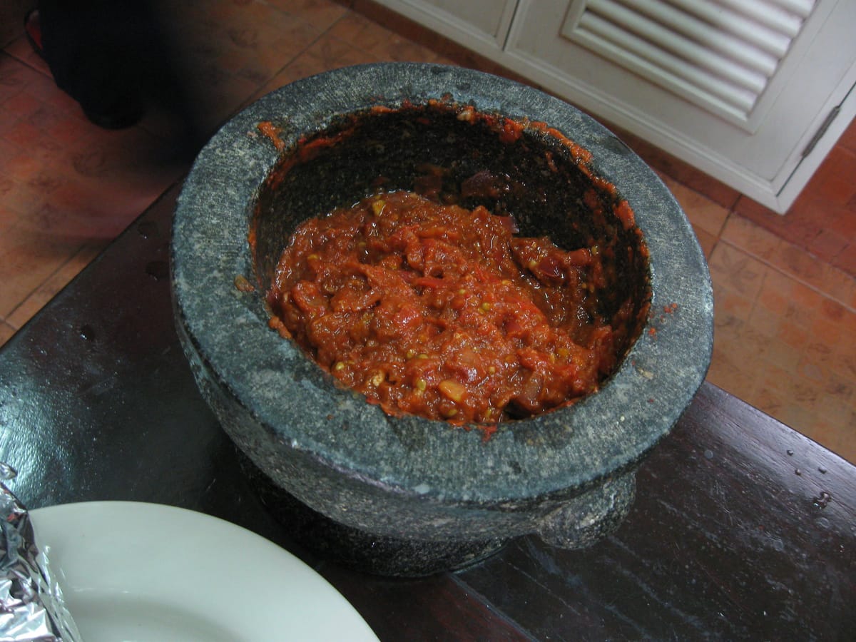 2. To make the paste in a mortar and pestle: Pound ingredients until thoroughly mashed and semi-liquified. If you have a small mortar, you can pound the tomatoes separately and then combine them with the rest of the paste.