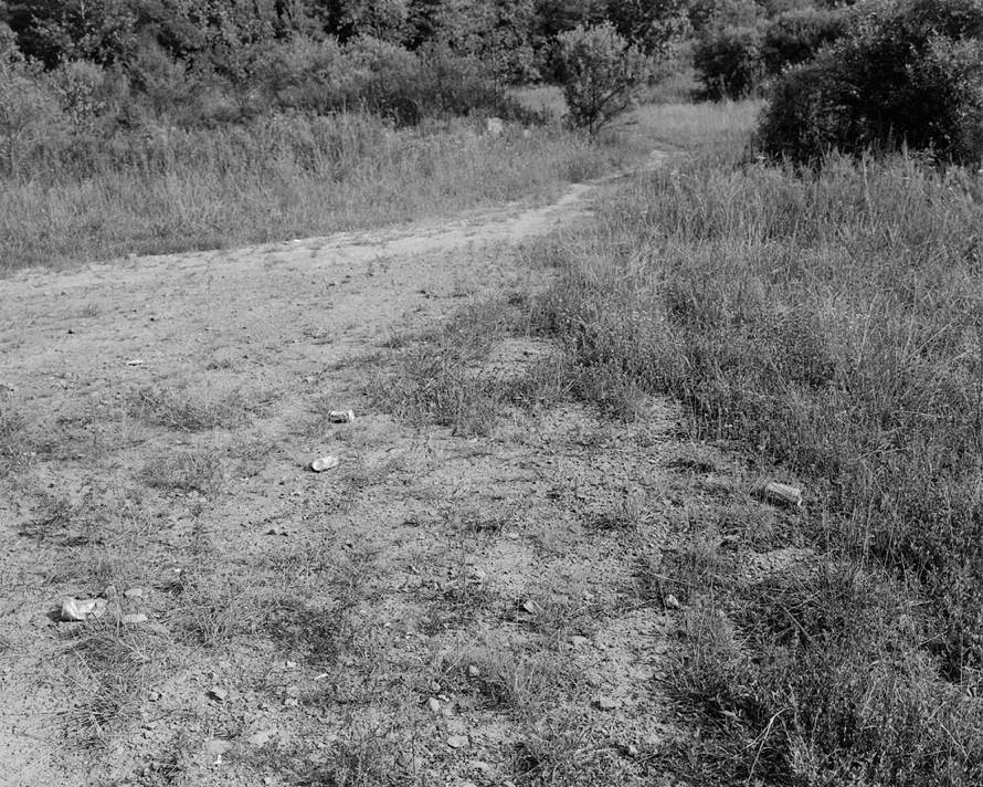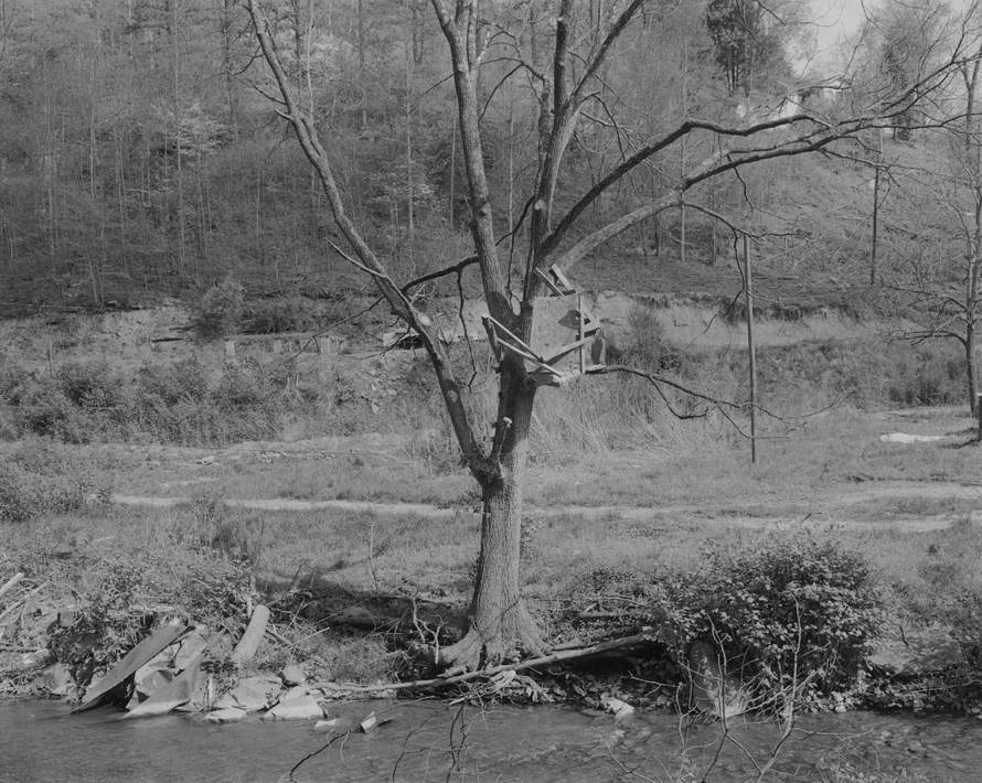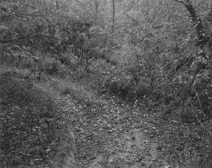 However I suppose my work could also be seen to comment on man’s current use of the landscape. Many of the trails in the photographs were once built for differing reasons that include residential, mining, and the natural gas industry. Some of those trails were then semi-repurposed for recreational all-terrain vehicle use. One sees trash that is strewn around in some images while in another a tree is adapted for hunting with a tree stand.