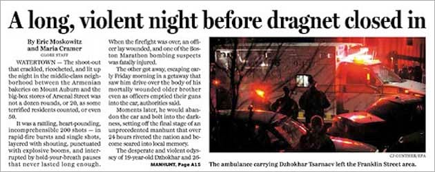 During the week that followed, Kitzenberg became the authoritative source for coverage of the Watertown shootout. He spoke with reporters at the New York Times and the Minneapolis Star Tribune in his home state of Minnesota. He appeared alongside Jake Tapper on CNN’s The Lead and next to Erica Hill on The Today Show. On Dateline NBC, anchor Lester Holt said Kitzenberg’s “photos and observations offer some of the best information we have about how the suspects behaved.”