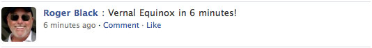Andrew Womack (6:46 a.m. Austin time): Six minutes ago, on my Facebook feed, a friend announced, “Vernal equinox in 6 minutes!” Here we go!